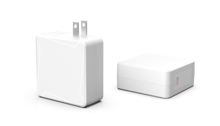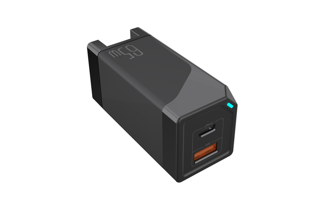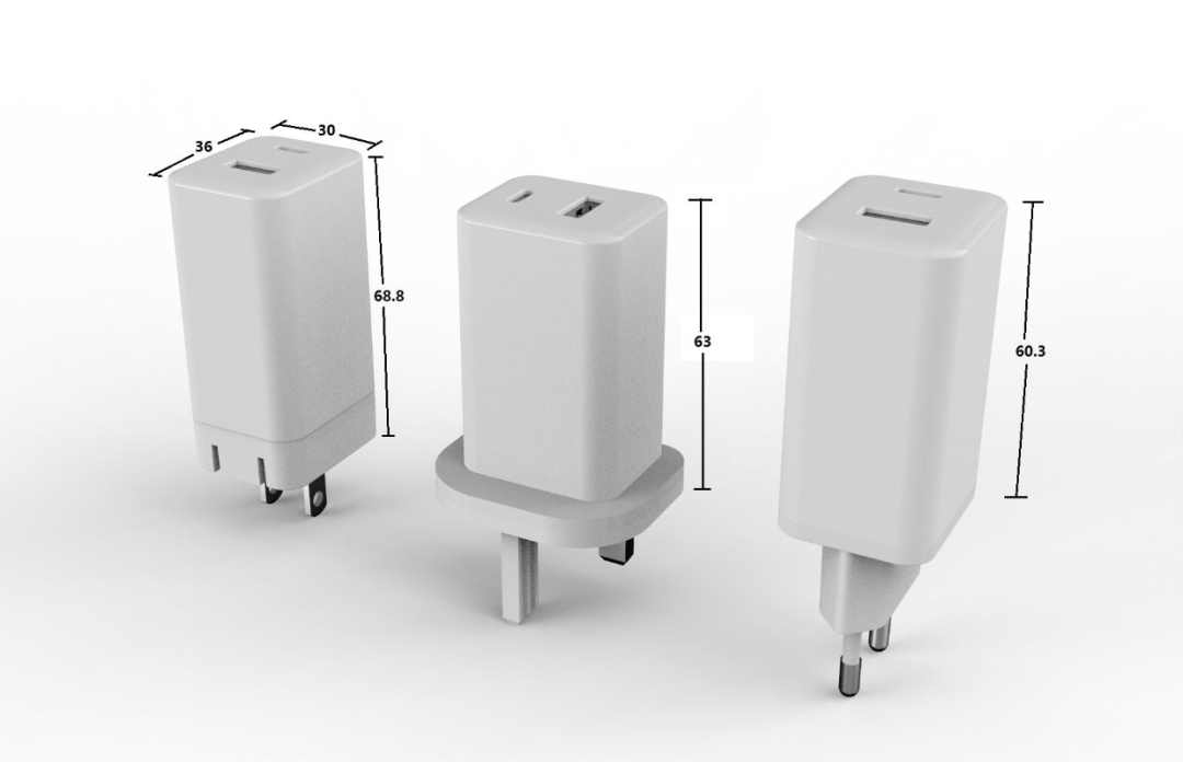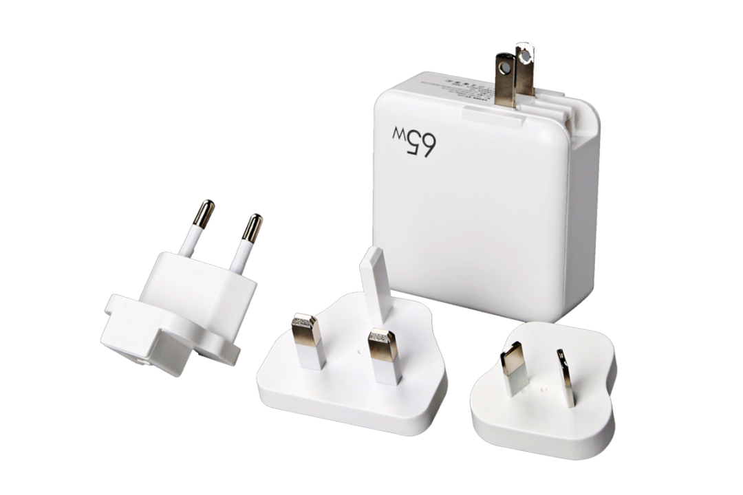 德立华65W2C1A氮化镓快充充电器外壳采用PC阻燃材料。配备美规90度折叠插脚,预留可配欧规、英规、澳规等插脚。