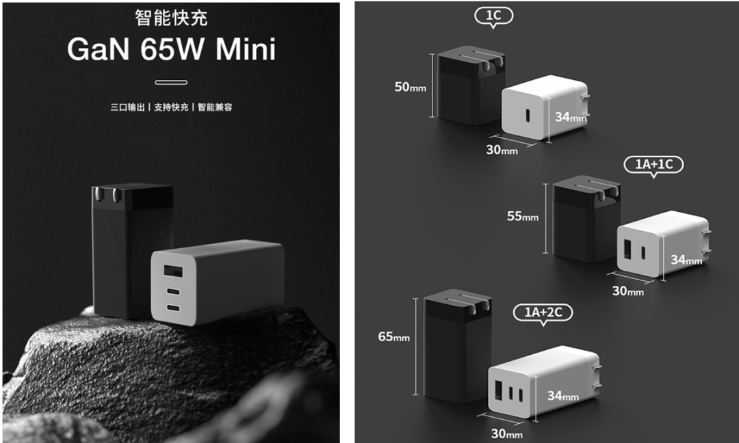 昭文电子65W氮化镓快充系列分为65W单口、65W1A1C、65W2C1A三种接口类型,并且三款产品均采用折叠插脚设计。得益于氮化镓功率器件的是采用,其中单口充电器尺寸仅为30*34*50mm、即使65W2C1A三口充电器,尺寸也只是将长度增加到了65mm,功率密度达到0.98W/cm³,处于同级别产品领先水平。产品同样拥有CCC、ETL、FCC、CE等多种认证,电商品牌即可上架。