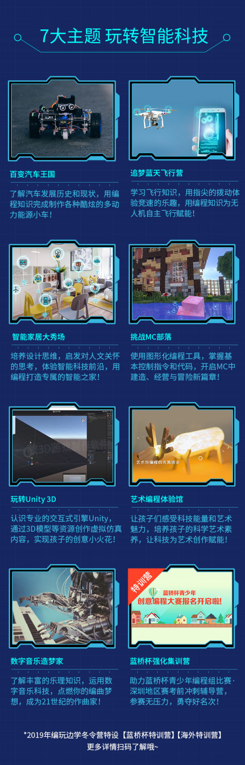 第二期“多学科编程冬令营”则集结了国内外新潮智能科技成果,将孩子喜爱的事物和少儿编程趣味结合,开设了百变汽车王国、追梦蓝天飞行营、智能家居大秀场、挑战MC部落、玩转Unity3D、艺术编程体验馆、数字音乐造梦家7大主题课程,以丰富的多学科学习拓宽视野,在不同学科的思维碰撞中激发孩子潜力,让他们在热爱中掌握技能、实现“多维发展”。