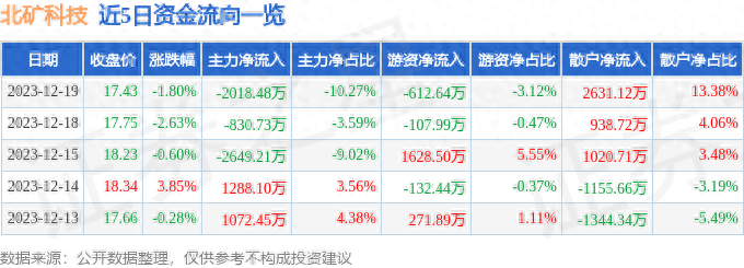 证券之星消息,截至2023年12月19日收盘,北矿科技(600980)报收于17.43元,下跌1.8%,换手率7.21%,成交量11.24万手,成交额1.97亿元。