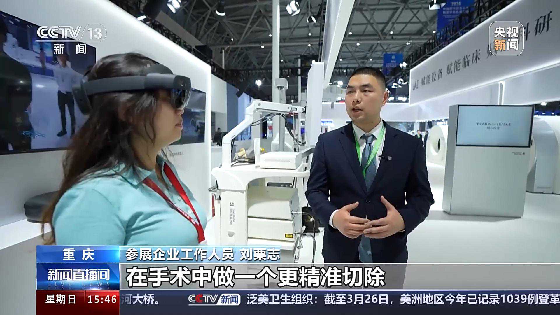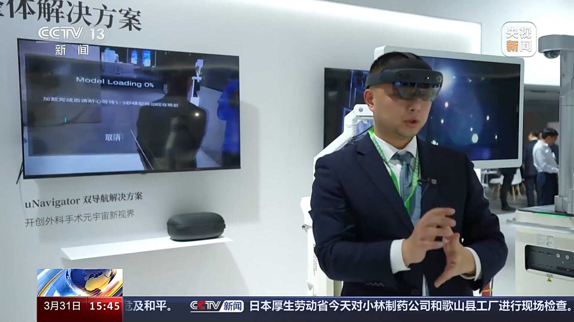 参展企业工作人员刘栗志:在我们的眼睛里面是已经有一个模型,这边显示了我们一个肝脏的模型,它主要是在术中的时候,临床老师戴眼镜的话,它可以和我们的手术腔镜画面做一个实时的配准,能够帮助我们在手术中做一个更精准的切除。