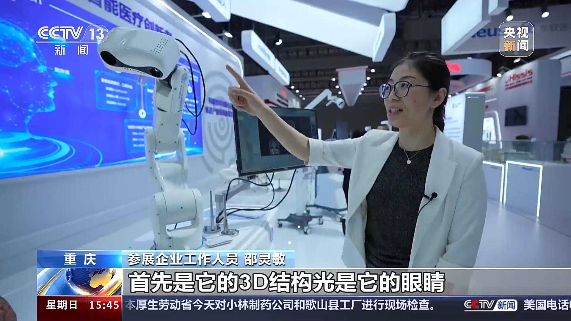 参展企业工作人员邵灵敏:这是一款我们自主研发的神经外科手术机器人,首先它的3D结构光是它的眼睛,在手术的过程中,它主要起到位置的注册和配准的作用,另外机械手臂可以在术中引导医生自动进行肿瘤、脑出血、癫痫等病灶的自动定位,降低手术的风险。