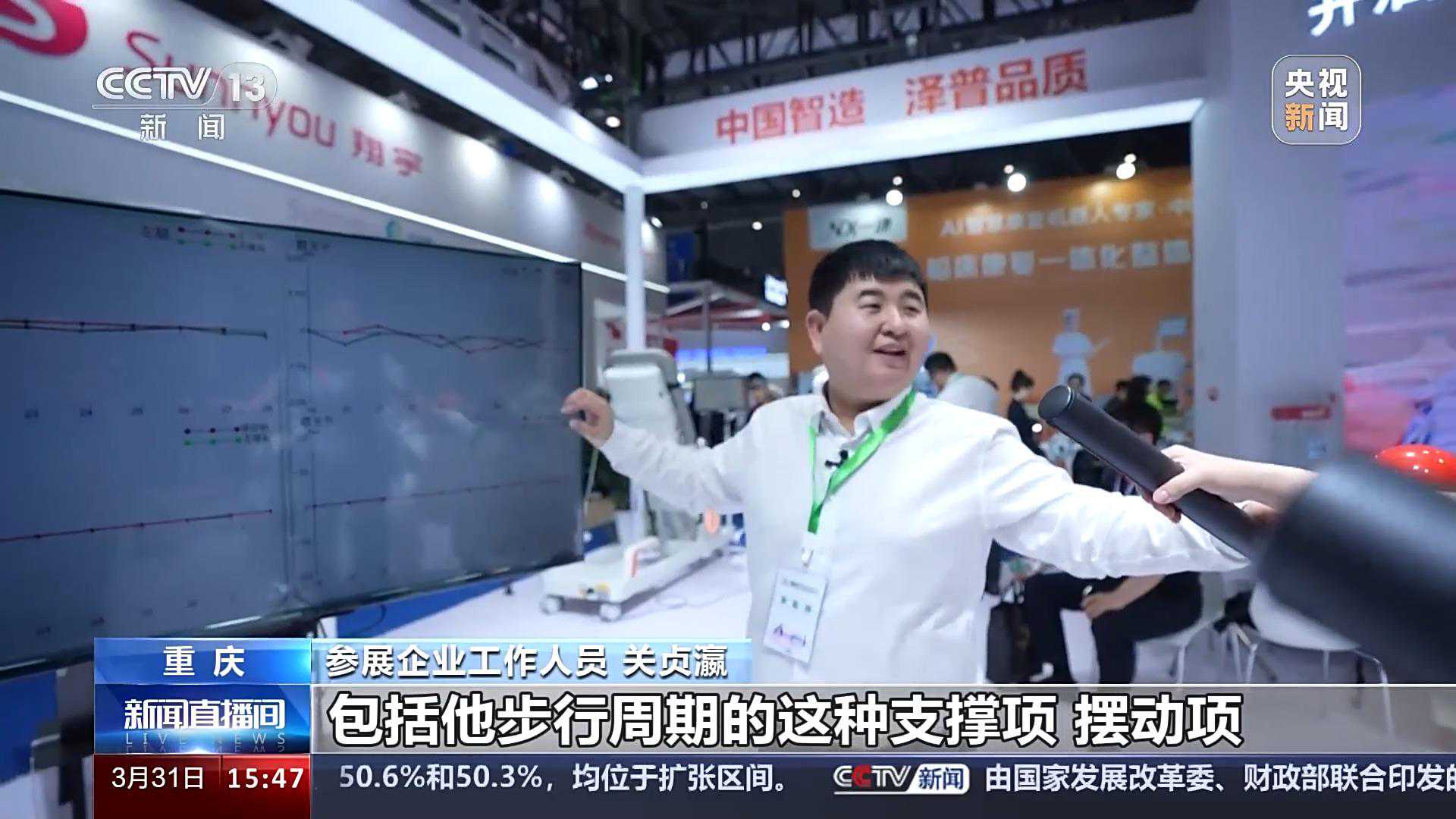 参展企业工作人员关贞瀛:这个就是我们的下肢机器人,它主要是为我们一些偏瘫的病人恢复一个步行训练的。来,用力往前踢,看到了吗?你看右腿用力了,你看你的一个支撑项就上来了,就说明你刚才在发力。在临床上治疗师也可以通过这个来判断患者的发力方式是否正确,包括步行周期的这种支撑项、摆动项,是髋关节出了问题,还是膝关节出了问题,我们都可以清晰地看到。