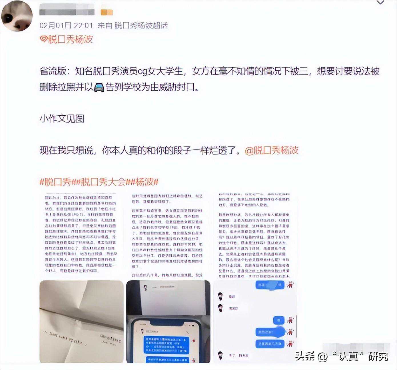 近日,深陷出轨风波的脱口秀演员杨波,在微博上发文称,头孢喝酒根本死不了,疑似就出轨女粉丝事件自杀。