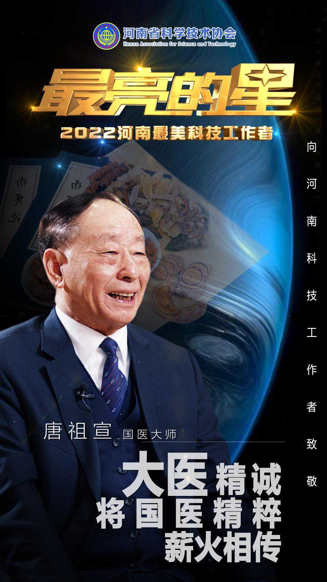 唐祖宣,国医大师、中国中医科学院学部委员、邓州市中医院院长、中医主任医师,国家级有突出贡献的中青年专家、享受国务院政府特殊津贴、全国先进工作者、全国卫生文明先进工作者、全国中医药杰出贡献奖获得者;研制出治疗血栓病的国家三类新药“脉络舒通”;出版著作139部,形成了唐祖宣书系;在全国人大代表履职期间提出议案、建议1168件;在助推国家中医药大政方针制定、建立健全各级中医药管理机构、中医药立法、发展基层中医药事业、发挥中医药防治重大疫病作用等工作中作出了突出贡献。