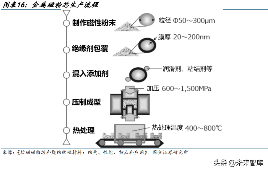 从制备工艺看,金属磁粉芯是通过在磁粉颗粒表面涂抹绝缘介质,然后利用粉末冶金工艺将其压制成所需形状得到的,包括磁粉颗粒制备、粒度配比、绝缘包覆、压制成型、热处理几个步骤。