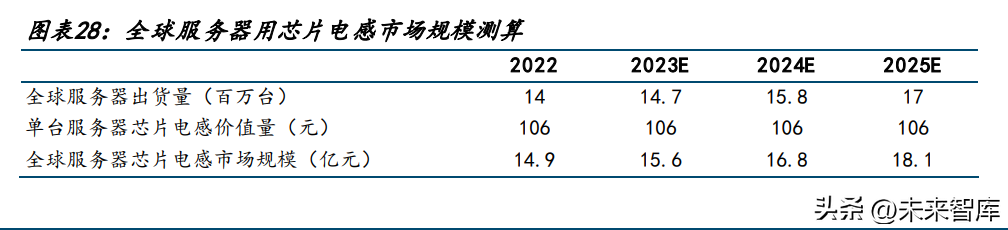 AI服务器一般配置4-8颗GPU,根据部分GPU搭载6颗电感,AI服务器一共需要24-48颗电感。根据铂科新材公告,单颗芯片电感价值量在3-10元,约1美元,则单台AI服务器芯片电感价值量在24-48美元。根据产业链调研,单台普通服务器芯片电感价值量约15美元,因此AI服务器相较普通服务器芯片电感价值量多60%-220%。根据Trforce数据,22年全球服务器出货量约1400万台,搭载GPU的AI服务器年出货量占整体服务器比重近1%,约14万台,23年AI服务器(包含搭载GPU、FPGA、ASIC等)出货量近120万台,同增38.4%,占整体服务器出货量近9%,至26年将占15%。预计23-25年全球服务器出货量分别为14.7、15.8、17百万台,单台服务器芯片电感价值量按照15美元,预计25年全球服务器芯片电感市场规模18.1亿元。随着AI服务器在整体服务器中占比持续提升,芯片电感市场规模将快速增长,目前该领域以海外企业TDK、村田等的铁氧体产品为主,未来升级替代空间巨大。