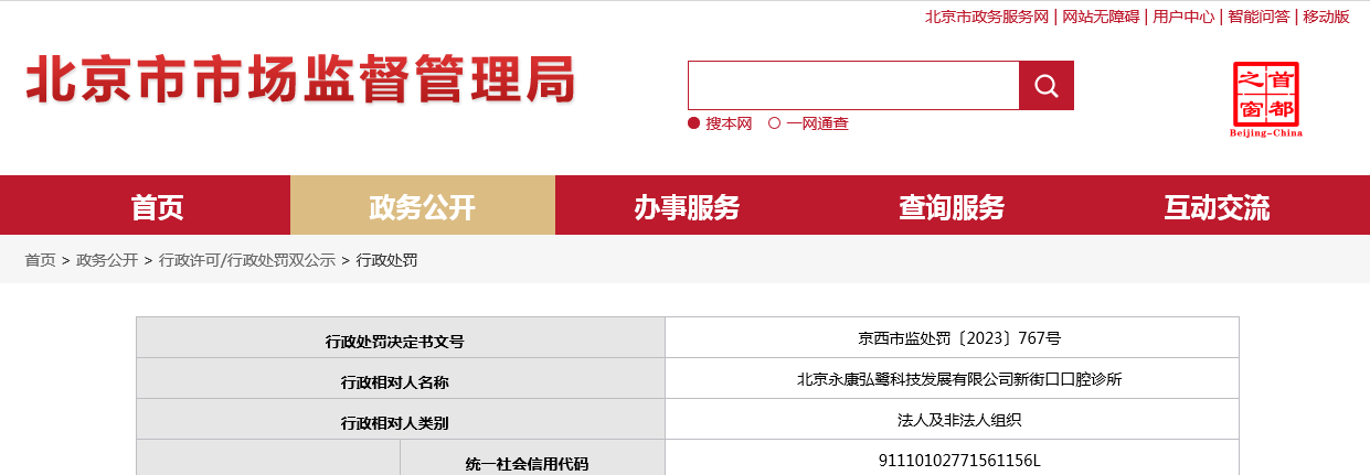 中近日,北京市西城区市场监督管理局对北京永康弘鹭科技发展有限公司新街口口腔诊所作出行政处罚,给予警告,罚款20000元并没收非法财物。行政处罚决定书文号:京西市监处罚〔2023〕767号。