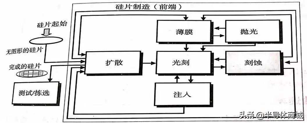 在半导体制造中有两种基本的刻蚀工艺:干法刻蚀和湿法腐蚀。干法刻蚀是把硅片表面曝露于气态中产生的等离子体,等离子体通过光刻胶中开出的窗口,与硅片发生物理或化学反应(或这两种反应),从而去掉曝露的表面材料。干法刻蚀是亚微米尺寸下刻蚀器件的最重要方法。而在湿法腐蚀中,液体化学试剂(如酸、碱和溶剂等)以化学方式去除硅片表面的材料。湿法腐蚀一般只是用在尺寸较大的情况下(大于3微米)。湿法腐蚀仍然用来腐蚀硅片上某些层或用来去除干法刻蚀后的残留物。