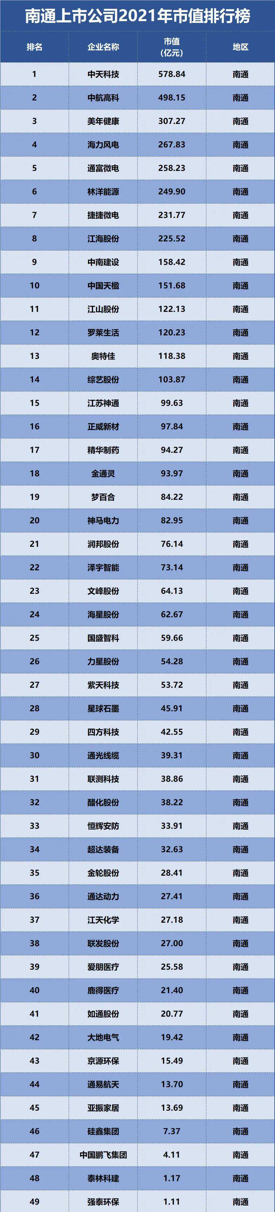 南通市49家上市公司中,其市值超过100亿元的共有14家。分别是中天科技、中航高科、美年健康、海力风电、通富微电、林洋能源、捷捷微电、江海股份、中南建设、中国天楹、江山股份、罗莱生活、奥特佳和综艺股份。这14家企业是南通市优质企业的代表,基本上涵盖了所有行业,可见南通市是全面发展,尤其是在健康、科技、建筑上犹如突出。