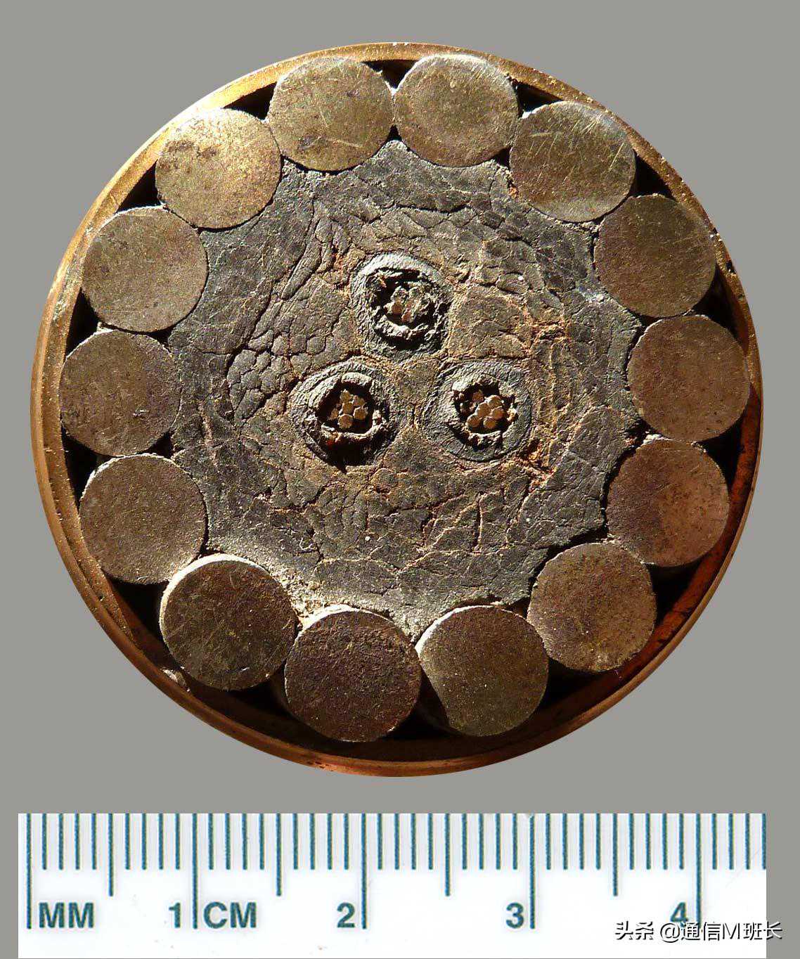 图8早期海底电缆的横截面。外金属线是用来增强强度的。里面的黑色材料是牙胶绝缘材料。实际的信号是