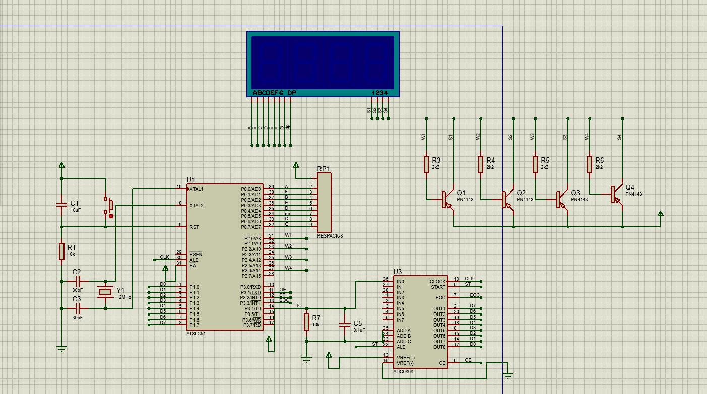 单片机选择AT89C51。(位选四根线,控制四根线,ADC和单片机通信需要8根线,数码管和单片机通信也需要八根线,故选择有大于24根线的单片机)