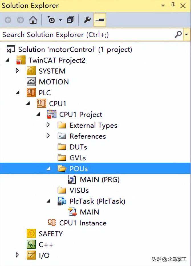 添加完成后,“CPU1Project”中会有POUs、GVLs、DUTs等文件夹。其中,POU是程序组织单元,GVL是全局变量列表,UDT是用户自定义变量。我们计划编写一个电机控制的函数块,因此在“POUs”文件夹右键单击,在弹出的对话框中选择“添加(Add)”→“POUs”,如下图所示: