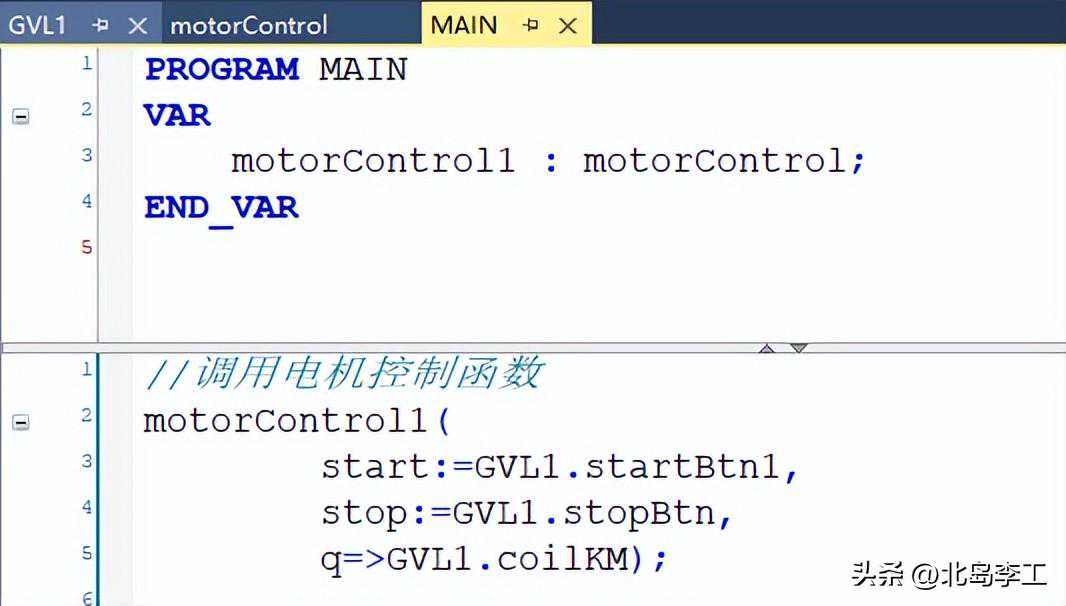 接下来要在主函数(MAIN)中调用电机控制函数块。首先在变量列表中声明motorControl的实例,命名为“motorControl1”,编写控制代码如下图所示: