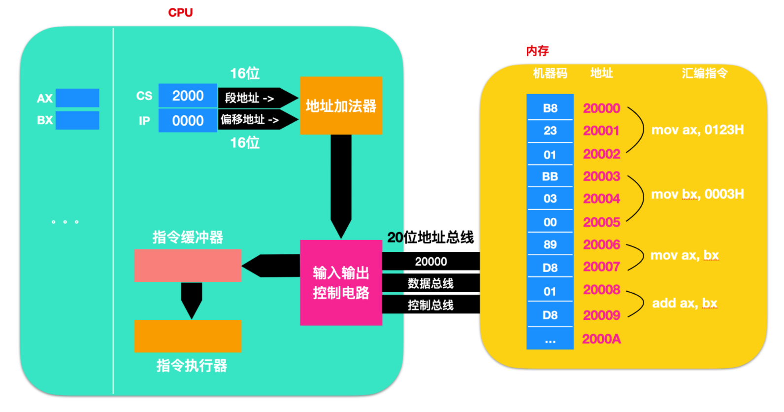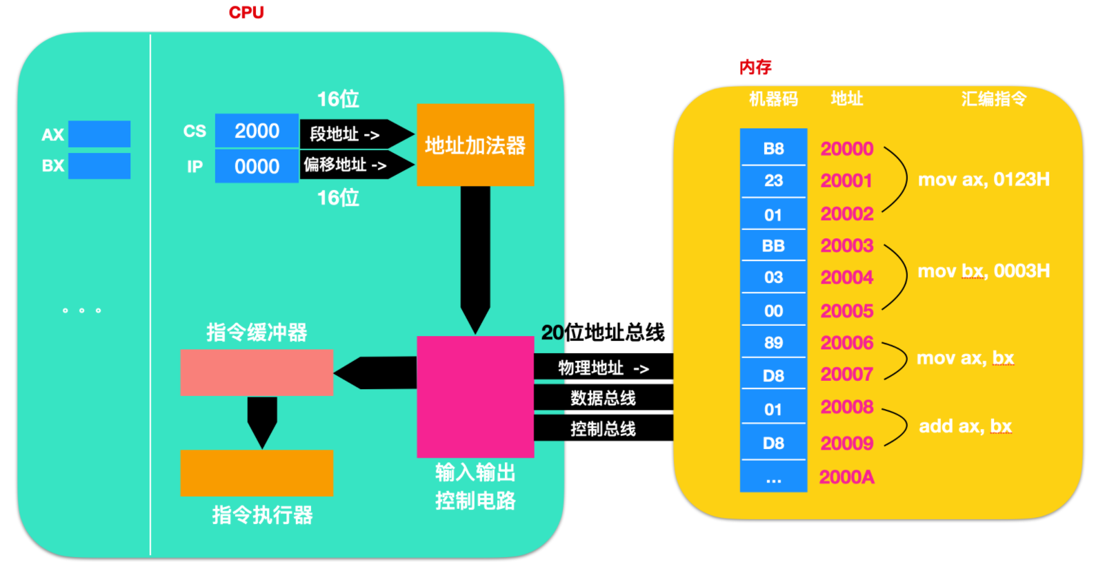 在CPU内部,由CS、IP提供段地址,由加法器负责转换为物理地址,输入输出控制电路负责输入/输出数据,指令缓冲器负责缓冲指令,指令执行器负责执行指令。在内存中有一段连续存储的区域,区域内部存储的是机器码、外面是地址和汇编指令。