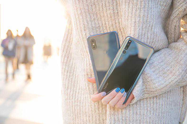 而两款手机背部的外观就不太一样了。小米MIX3是彩色陶瓷机身,而荣耀Magic2则是渐变镀膜工艺的玻璃机身,虽然都是四曲面设计,但是小米MIX3无论从观感还是手感上来说都要更加通透和顺滑。