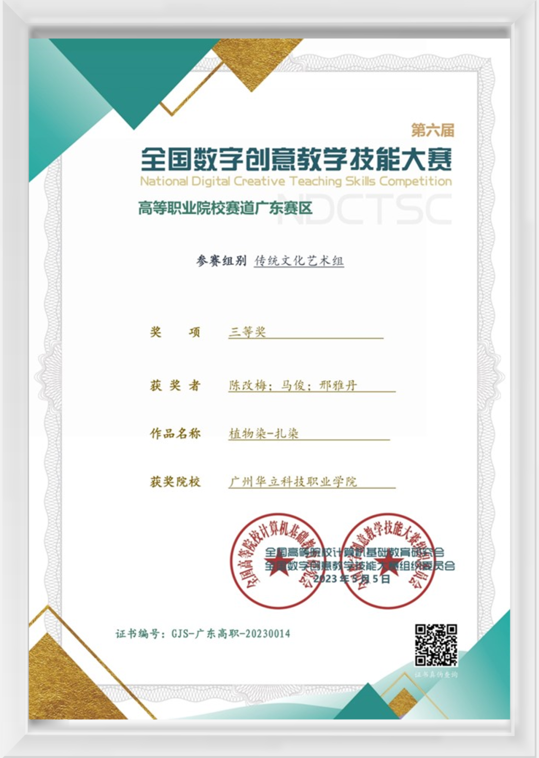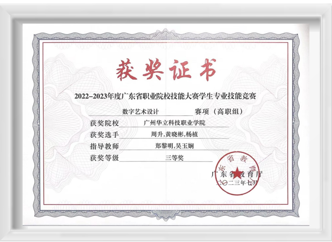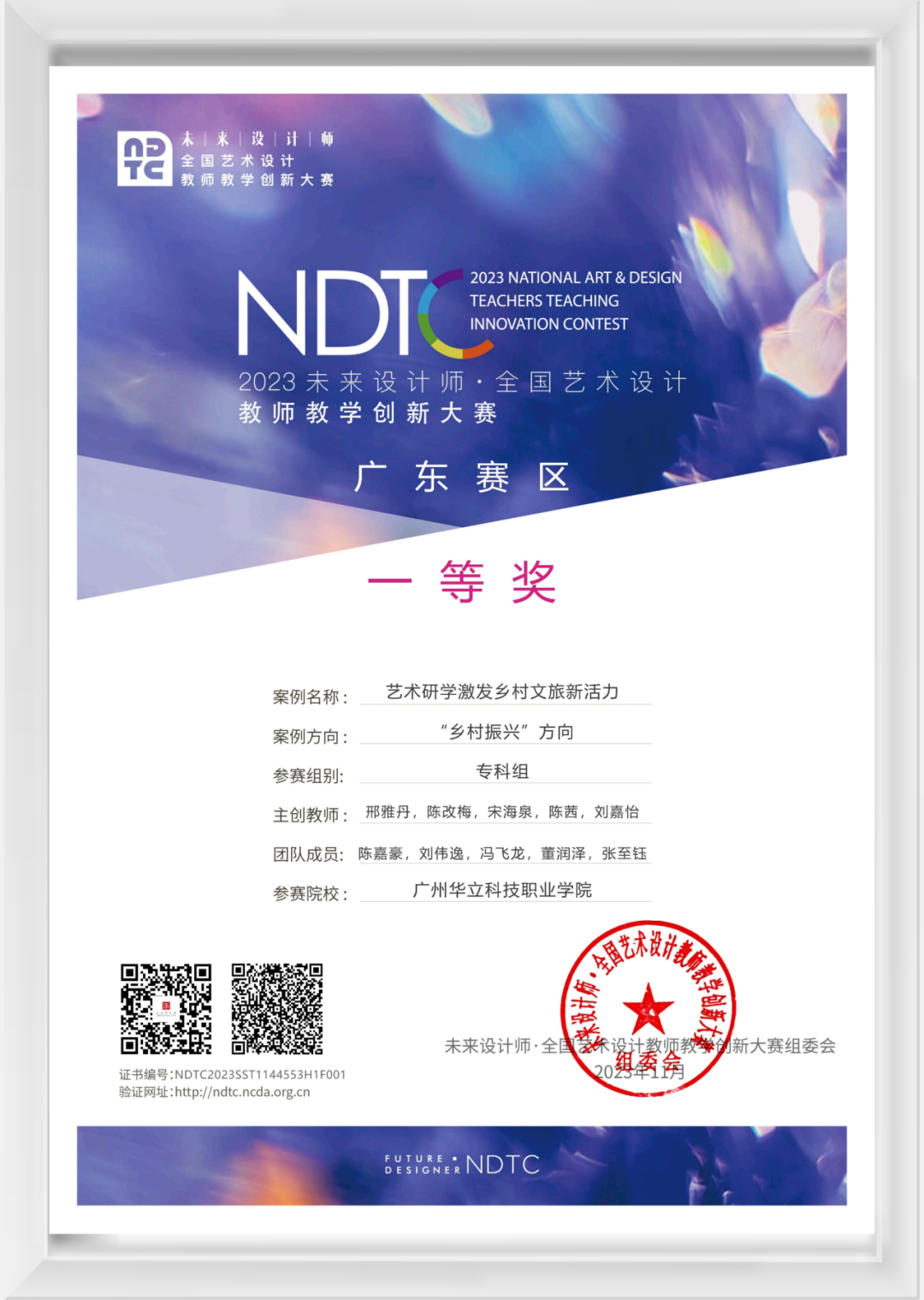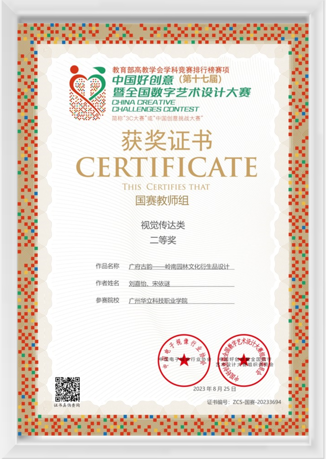 广州华立科技职业学院艺术与传媒学院师生在未来设计师全国高校数字艺术设计大赛中斩获一等奖共1项;广东省一等奖1项;二等奖4项;三等奖4项。在2023“国青杯”全国高校艺术设计作品展中获得一等奖14项;二等奖共21项;三等奖21项。在第十四届蓝桥杯大赛视觉艺术设计赛取得广东省一等奖1项;二等奖共1项;三等奖8项;优秀奖5项。在2023第15届全国大学生广告艺术大赛中获广东省二等奖1项,三等奖2项。