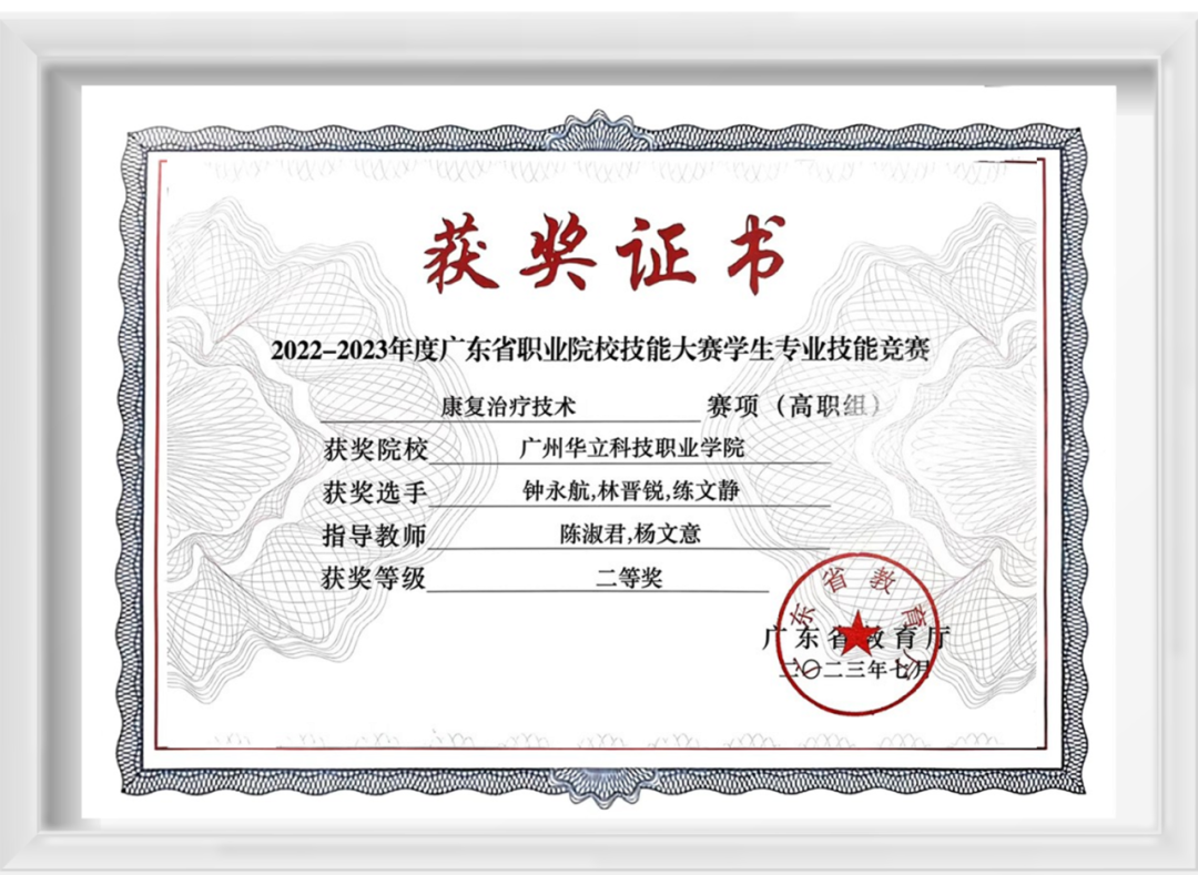 •2022-2023年广东省职业院校学生专业技能大赛康复治疗技术赛项二等奖;