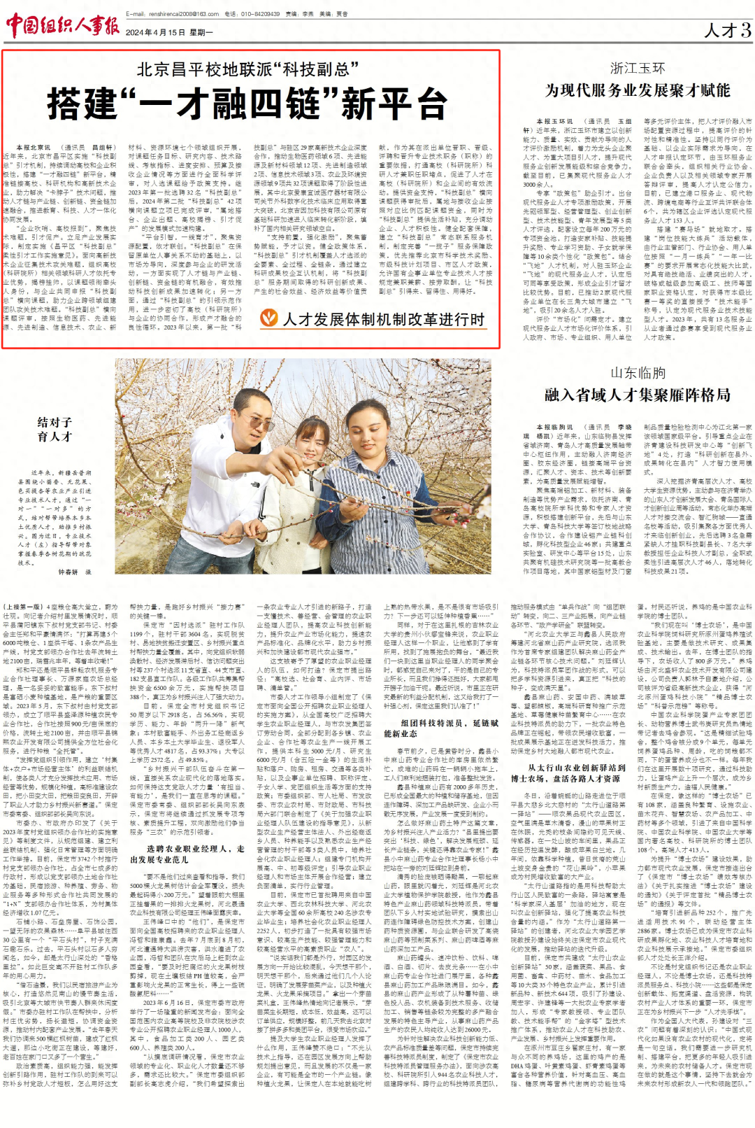 近年来,北京市昌平区实施“科技副总”引才机制,持续调动高校和企业积极性,搭建“一才融四链”新平台,精准链接高校、科研机构和高新技术企业,助力解决“卡脖子”技术问题,推动人才链与产业链、创新链、资金链加速融合,推进教育、科技、人才一体化协同发展。