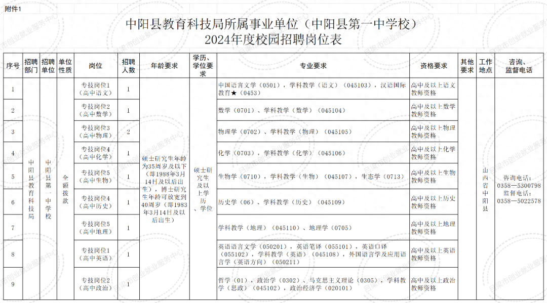 咨询、监督电话详见中阳县教育科技局所属事业单位(中阳县第一中学校)2024年度校园招聘教师岗位表》(附件1)。