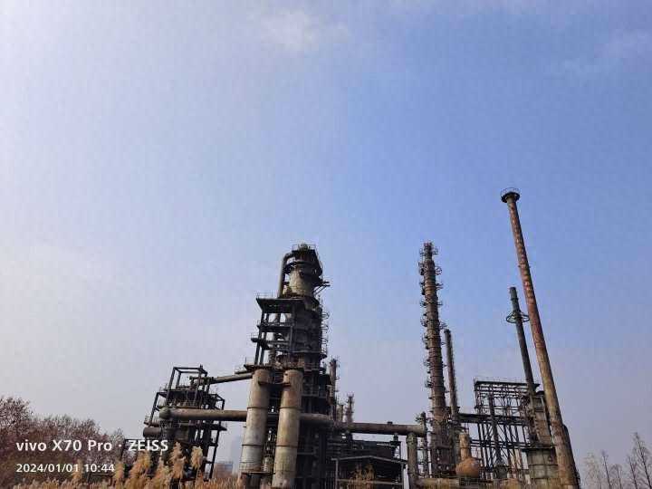“顽牛”还晒出工业园区的图片,从图中可以看到有许多锈迹斑斑但十分高大的罐体装置以及一些废弃的厂房模样的三角小楼。