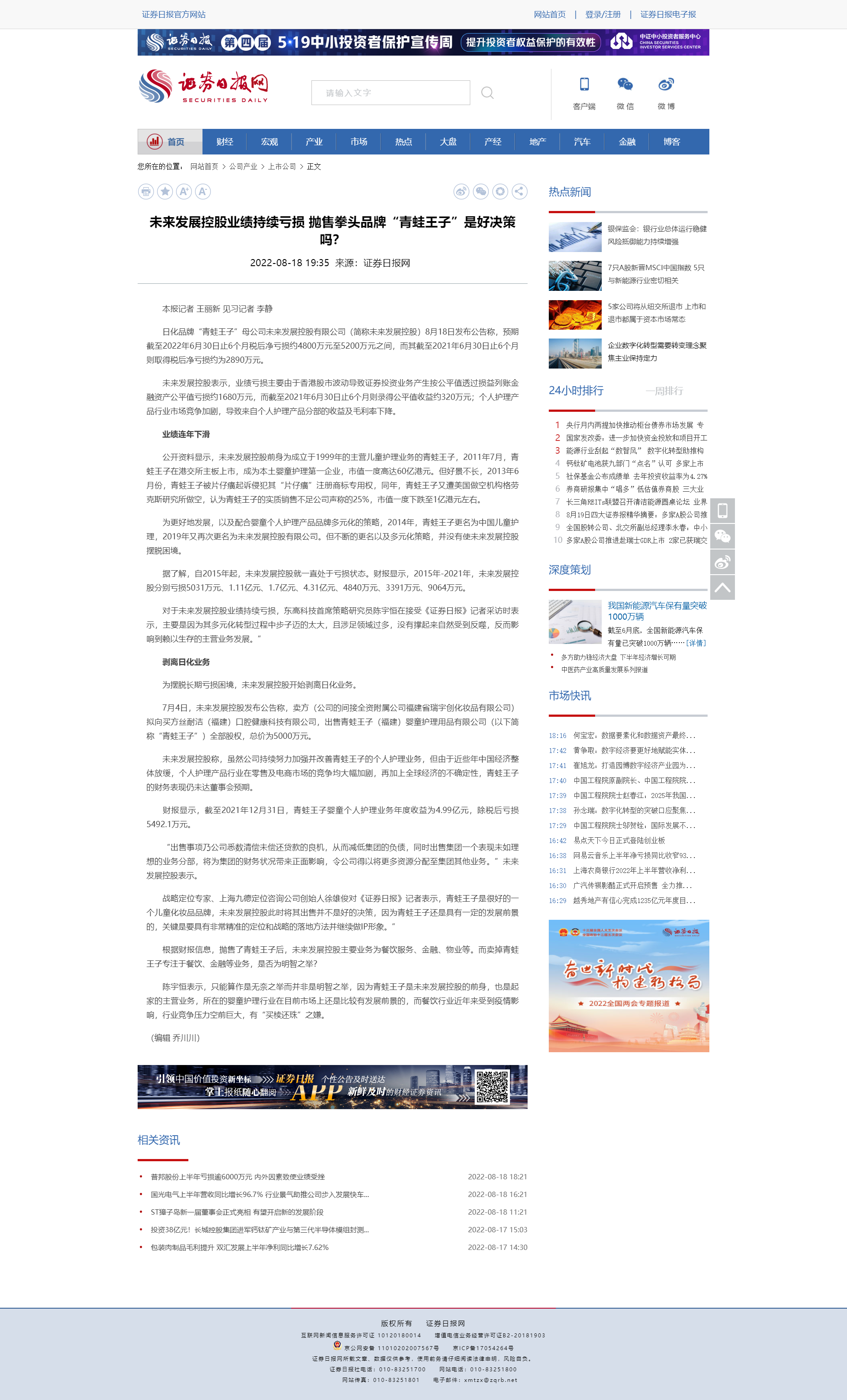 日化品牌“青蛙王子”母公司未来发展控股有限公司(简称未来发展控股)8月18日发布公告称,预期截至2022年6月30日止6个月税后净亏损约4800万元至5200万元之间,而其截至2021年6月30日止6个月则取得税后净亏损约为2890万元。