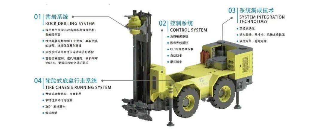 通过系统集成技术对整机尺寸进行低矮化设计,具有转弯半径小,成孔精度高,行走灵活,安全性高,整机采用功能模块化设计,结构紧凑,采场性能强,钻孔深度可达100米,能更好的适应国内矿山建设的发展需求。