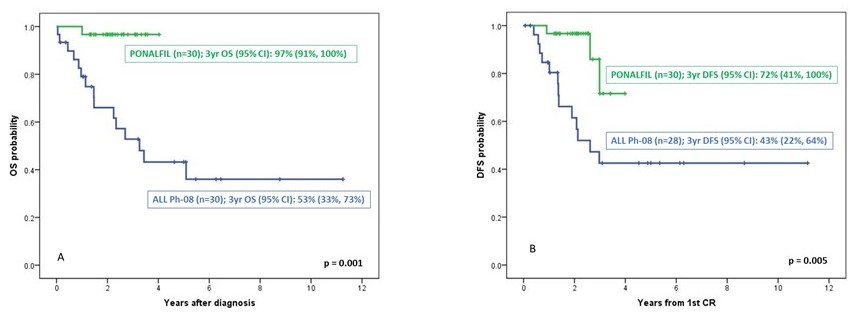 1:1匹配倾向性评分在每个队列中确定了30例患者(变量:年龄、性别、ECOG、WBC、CNS受累、细胞遗传风险和BCR/ABL蛋白水平)。PONALFIL和ALLPh08研究的2年DFS率分别为97%和62%(P=0.005),2年OS率分别为97%和66%(P=0.001)。