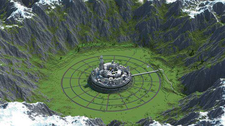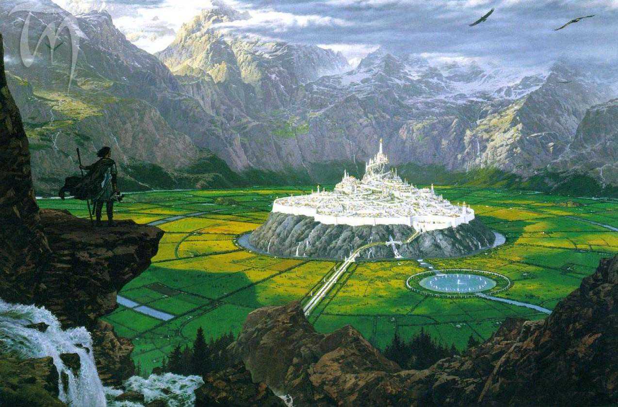 七重大门所扼守的道路不断攀升,直至升抵“环抱山脉”之巅。然后,在最后一重城门之后,山坡缓缓下行,进入图姆拉登的青翠山谷。谷地是一片翠绿的原野,中央耸立着阿蒙格瓦瑞斯-----一座坚硬光滑的石山。刚多林城就建筑在阿蒙格瓦瑞斯的平顶上。