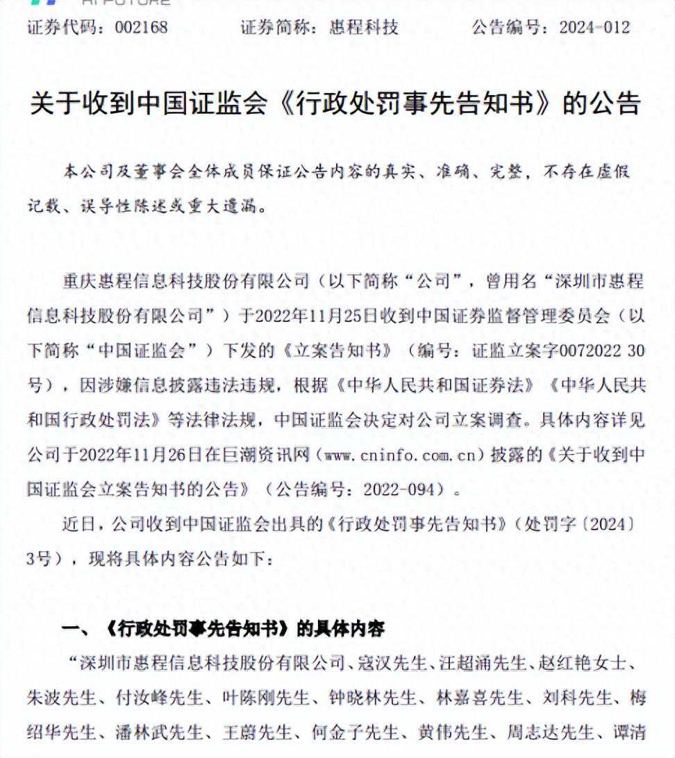 2024年1月20日,惠程科技发布公告称,收到中国证监会出具的《行政处罚事先告知书》(处罚字〔2024〕3号)。