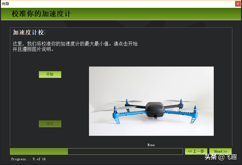 接着进行罗盘校准,将飞机旋转直至所有轴都旋转了360°(打到所有的小白点)