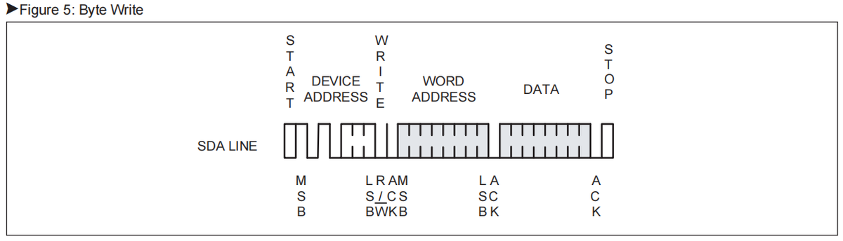 其中,字节写操作(ByteWrite)控制i2c与K24C02通信,通信内容为:从设备地址(1个字节,bit0为0,表示写)+存储地址(1个字节)+数据(1个字节,CPU发送给K24C0的存储内容)。具体数据传输如下图所示: