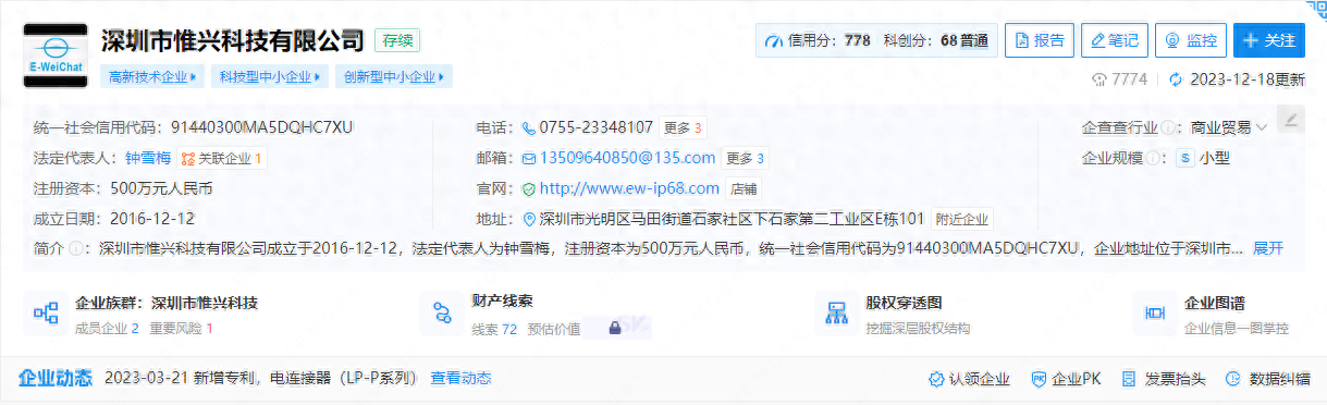 深圳市惟兴科技有限公司成立于2016年12月12日,注册地位于深圳市光明区马田街道石家社区下石家第二工业区E栋101。法定代表人:钟雪梅。一般经营项目是:国内贸易;货物及技术进出口。,许可经营项目是:电子产品、五金制品、塑胶制品、灯具配件、电线、防水接头、开关、连接器、防水插头、面板插头插座、防水连接线、LED连接头、航空插头、防水插座、防水对接头的研发、生产与销售;接线器组装;模具加工。二类医疗器械和防护用品(含口罩、额温枪)的销售