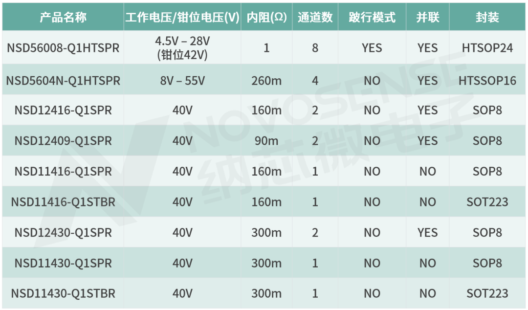 纳芯微低边驱动产品系列选型表: