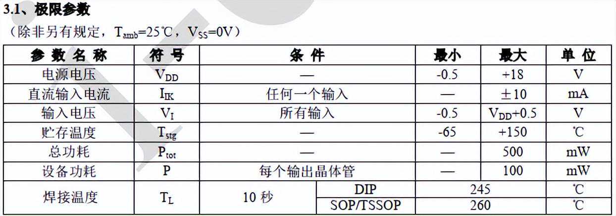 它的工作电压为3V~15V。未使用的输入必须连接到VDD,VSS或其他输入。