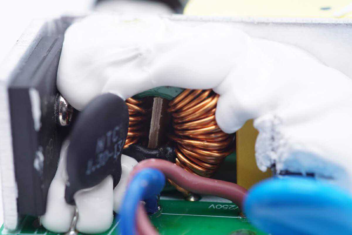 共模电感采用磁环绕制,内部设有电木板绝缘。