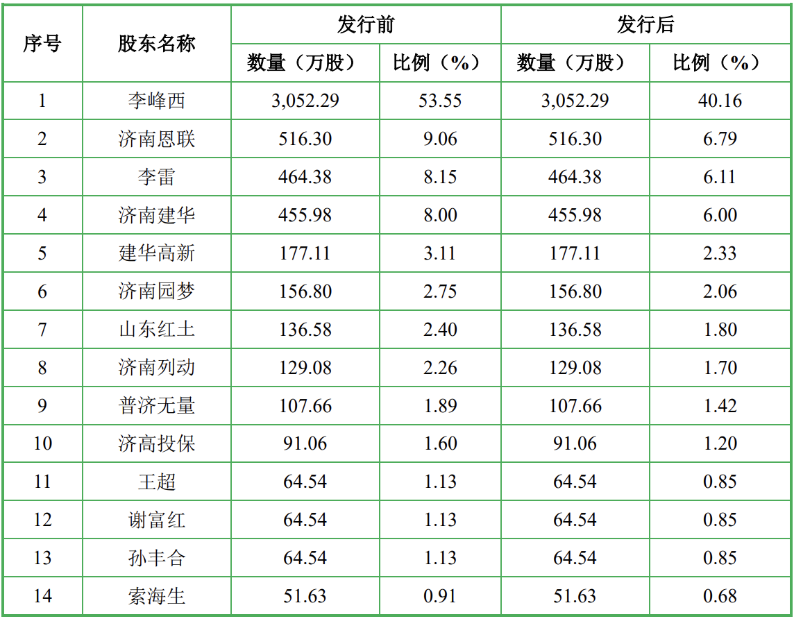 IPO前,李峰西直接持有森峰科技53.55%的股份,李雷直接持股8.15%,济南恩联持股9.06%,济南建华持股8.00%,建华高新、济南园梦、山东红土、济南列动、普济无量、济高投保分别持股3.11%、2.75%、2.40%、2.26%、1.89%和1.60%。