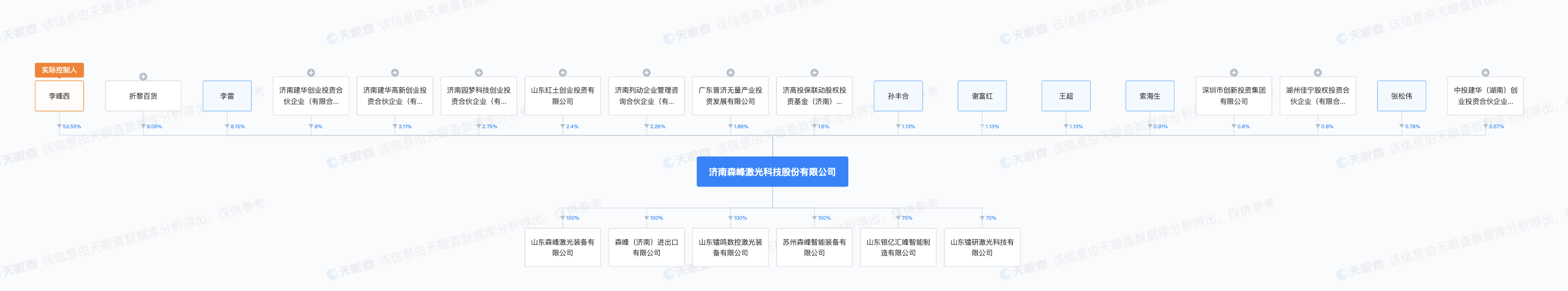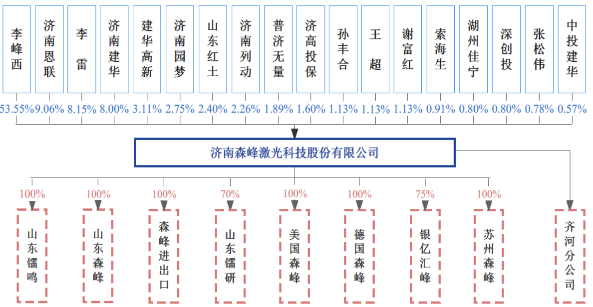 天眼查信息显示,森峰科技成立于2007年5月,前身为济南森峰激光技术有限公司。目前,该公司的注册资本为5700万元,法定代表人为李峰西,主要股东包括李峰西、折黎百货、李雷等。