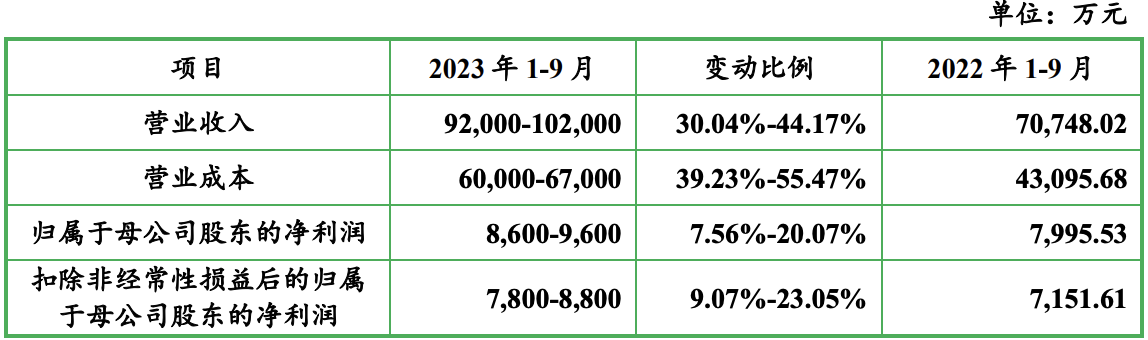 同时,森峰激光预计其2023年1-9月(前三季度)的收入约9.2亿元至10.2亿元,同比增长30.04%至44.17%;归母净利润8600万元至9600万元,同比增长7.56%至20.07%;扣非后净利润7800万元至8800万元,同比增长9.07%至23.05%。