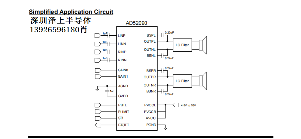 AD52090是一种高效的立体声D类音频放大器,具有可调的功率限制功能。扬声器驱动器从4.5V~26V电源电压下工作,模拟电路在5V电源电压下工作。在24V电源电压下,4Ω或8Ω扬声器可在1%THD+N范围内输出功率达到30W。AD52090提供并行BTL(Mono)应用,它可以在24V的电源电压下为4Ω喇叭提供60W。可调功率限制功能允许用户设置一个低于5V的一半的电压轨道,以限制通过扬声器的电流量。