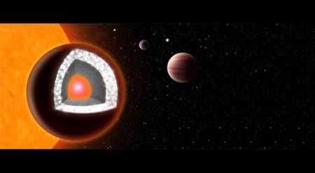 科学家们在评估了该星球的质量、半径,及其主恒星组成成分后,得出的结论是,“巨蟹座55E”的体积是地球的两倍,但质量要重8倍,该星球表面主要是石墨,下面是很厚的钻石层,再下面是一层主要由硅形成的矿物质,中间则是熔铁形成的核心。该研究估计,至少有三分之一的行星的质量大约相当于3个地球质量可能是钻石。