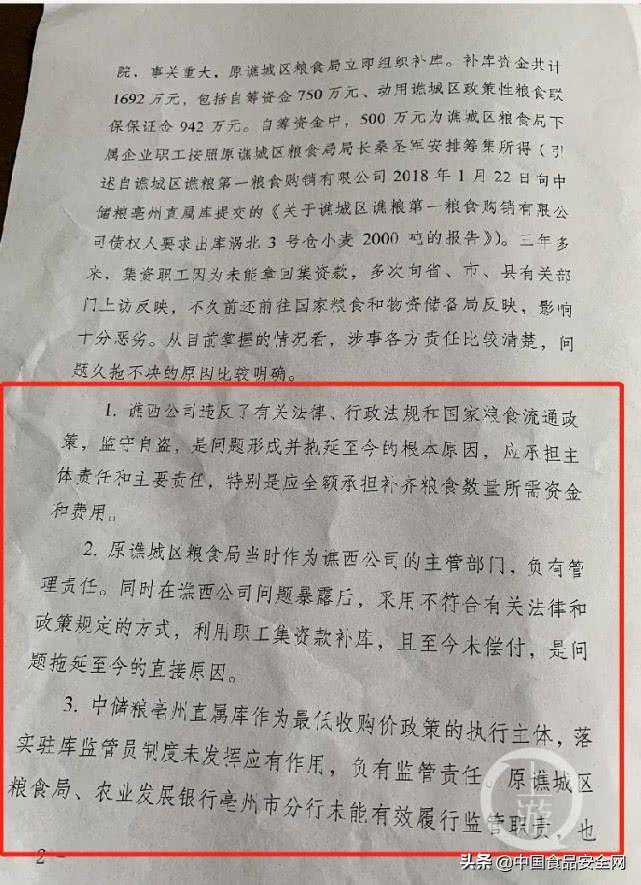 上游新闻记者了解,对于多部门事后联合补库试图掩盖盗卖真相的相关责任,《亏库函》指出,原谯城区粮食局作为主管部门负有管理责任,在谯西公司问题暴露后,采用不符合有关法律和政策规定的方式,利用职工集资款补库,是问题拖延至今(2019年4月)的直接原因。