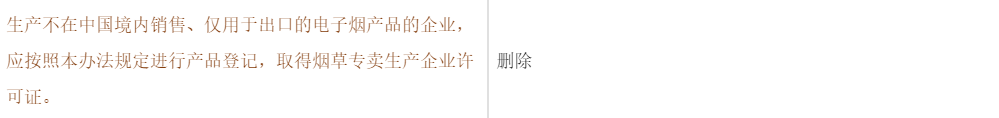 管理办法删除了此前征求意见稿中的“生产不在中国境内销售、仅用于出口的电子烟产品的企业,应按照本办法规定进行产品登记,取得烟草专卖生产企业许可证”的条款,进一步鼓励出口。