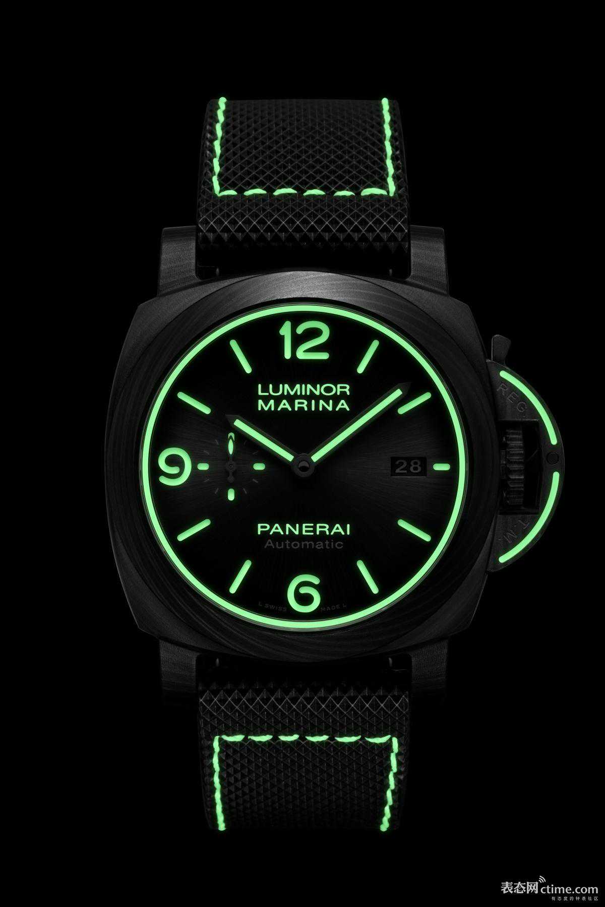 表壳:Carbotech™碳纤维表壳,表圈、表冠和表冠护桥装置(受商标保护)皆涂覆夜光物料显示轮廓;以钢玉制成的蓝宝石水晶玻璃表镜;12边形旋入式钛金属表背,覆有DLC涂层,镌刻“70年质保”字样。表盘:黑色表盘、太阳放射纹;三明治式结构;阿拉伯数字及小时标示以绿色Super-LumiNova™夜光涂层涂覆,绿色夜光显示,搭配夜光“LuminorMarina”和“Panerai”字样及白色“Automatic”字样;9点钟位置设小秒盘,3点钟位置设日期显示。表盘外缘饰有夜光涂层。