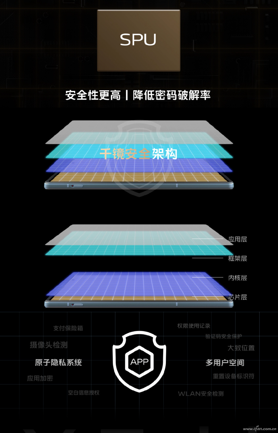 vivoXFold还结合SPU安全处理单元的硬件能力,在软件底层上构建了一张“织网”,全方位提升安全隐私保护能力。它遍布于设备的每次运算中,从芯片、内核、框架和应用4个层级,全方位覆盖手机的运行安全。