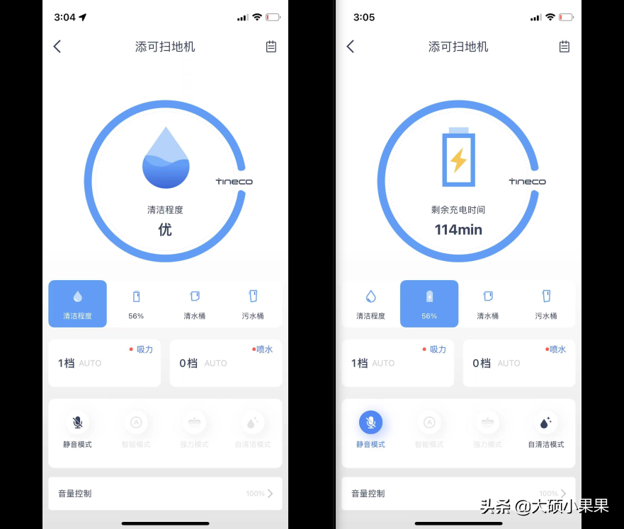 将添可芙万2.0连接到充电底座后,屏幕上就会显示出剩余电量,和我们平时使用的手机、平板等设备的UX设计基本一致。