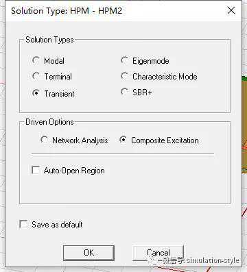 由于要模拟的是时域电磁脉冲激励产生的耦合效应,将SolutionType设置为Transient,DrivenOptions设置为CompositeExcitation,才能在后续的激励设置中定义所需的时域脉冲波形。