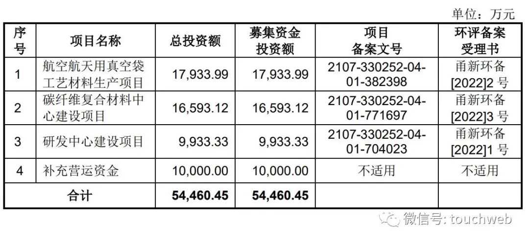 沥高科技计划募资5.45亿元,其中,1.79亿元用于航空航天用真空袋工艺材料生产项目,1.66亿元用于碳纤维复合材料中心建设项目,9933万元用于研发中心建设项目,1亿元用于补充营运资金。