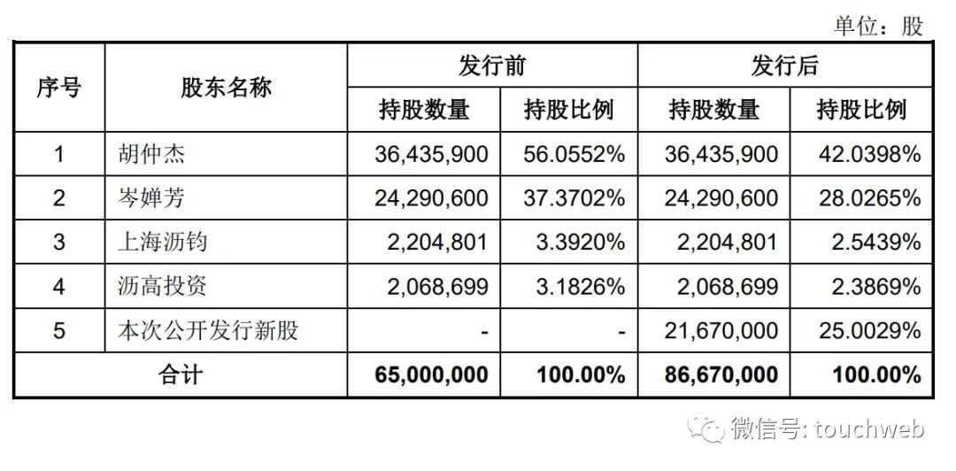 IPO后,胡仲杰持股为42.0398%,岑婵芳持股为28.0265%,上海沥钧持股为2.5439%,沥高投资。