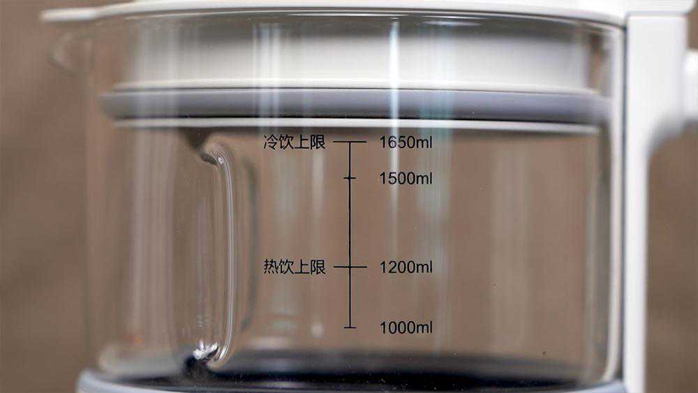 宜盾普破壁机的杯体下半部包裹面积比较大,导致可视窗口比较小,只能从1000mL的位置开始计量,但也还是标注了1200mL的热饮上限和1650mL的冷饮上限。